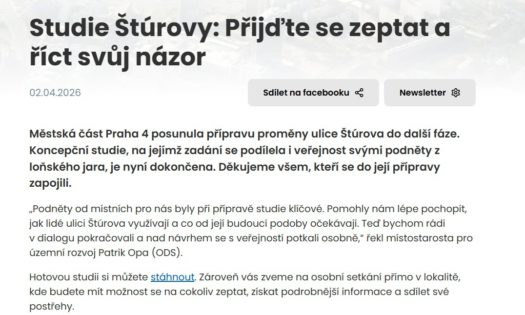 10.4.2026Městská část Praha 4 posunula přípravu proměny ulice Štúrova do další fáze. Koncepční studie, na jejímž zadání se podílela i [...]Omezení výuky 14. 4.
