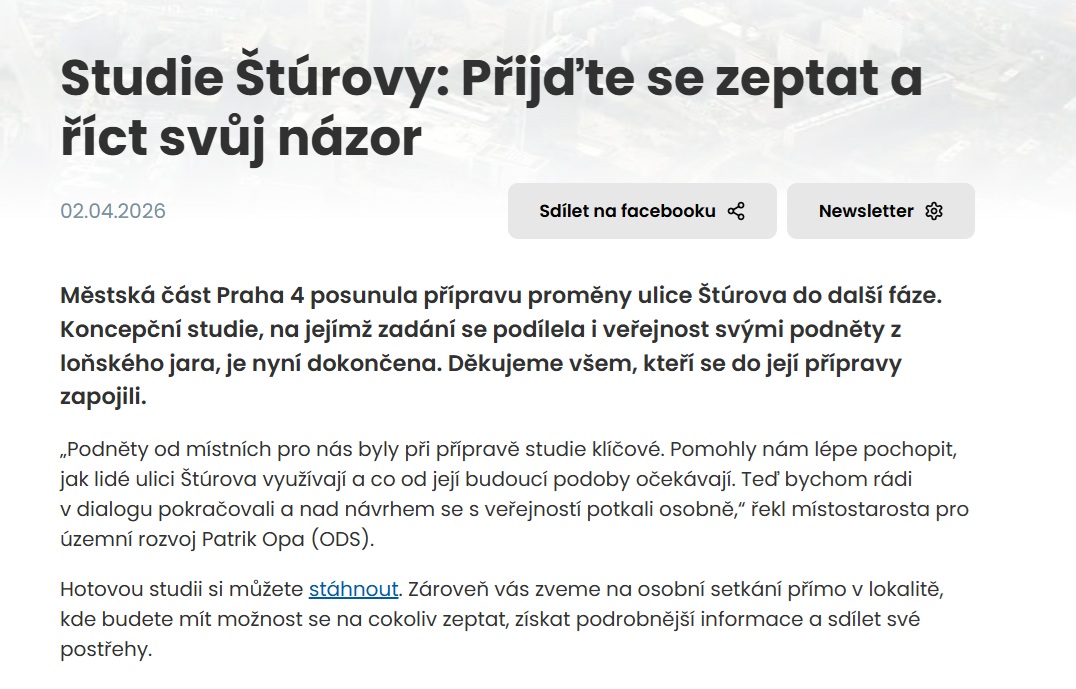 Městská část Praha 4 posunula přípravu proměny ulice Štúrova do další fáze. Koncepční studie, na jejímž zadání se podílela i veřejnost svými podněty z loňského jara, je nyní dokončena.
